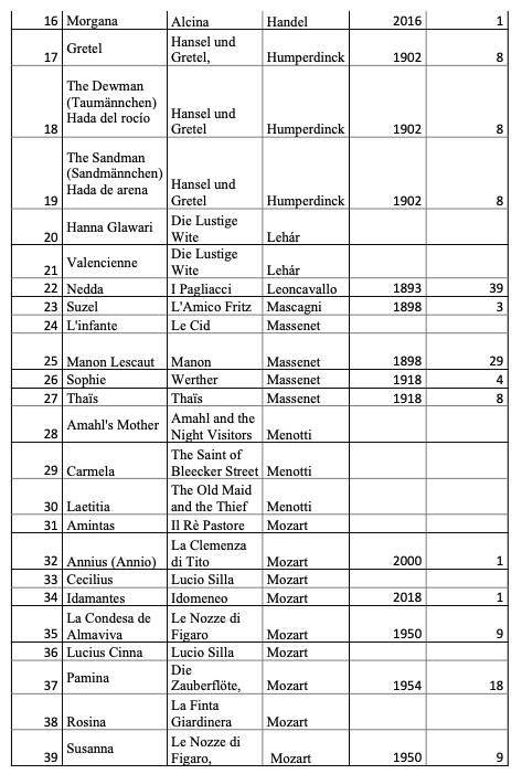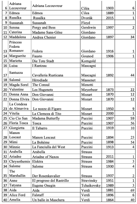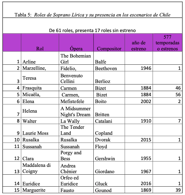 Como amo investigar, les comparto los recuadros de las producciones de Óperas que incluyen roles para sopranos líricas y/o sopranos lírico-spinto, las que tienen año de estreno, son las que se han producido en Chile. Estas óperas se han realizado en diferentes escenarios y varias de estas producciones no han tenido alcance en las publicaciones tradicionales de la historia de la ópera en Chile.